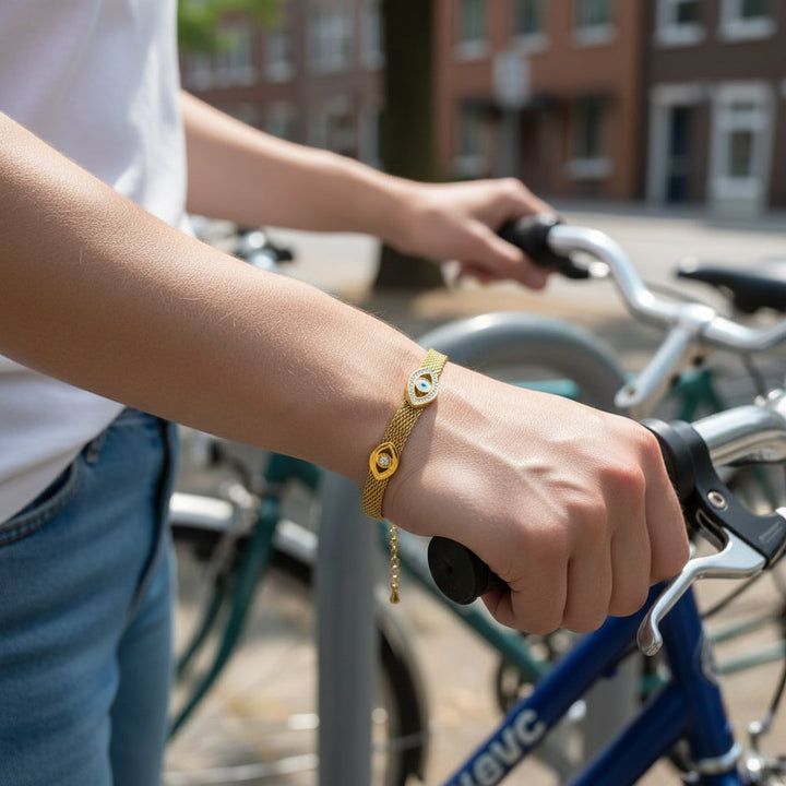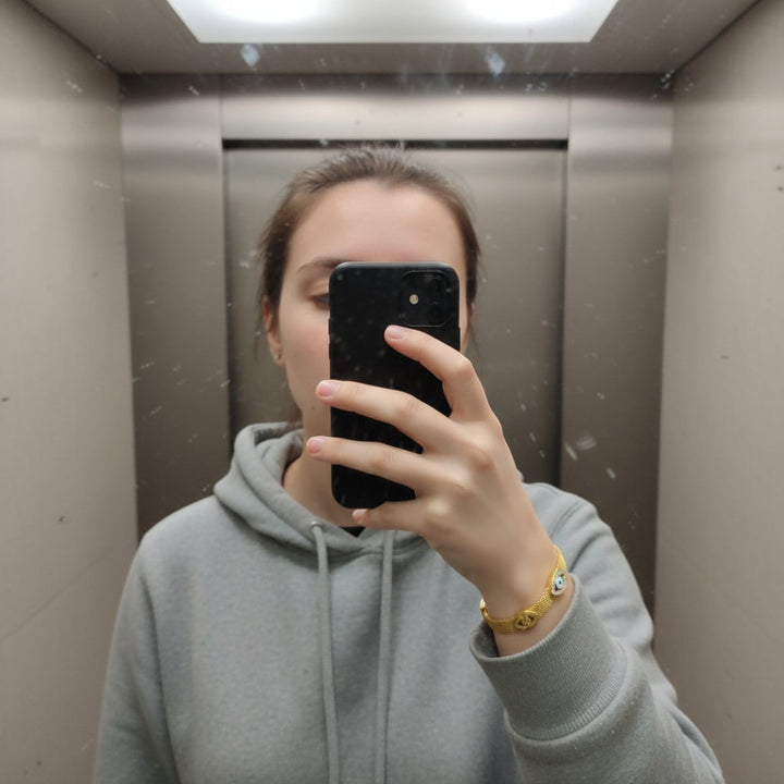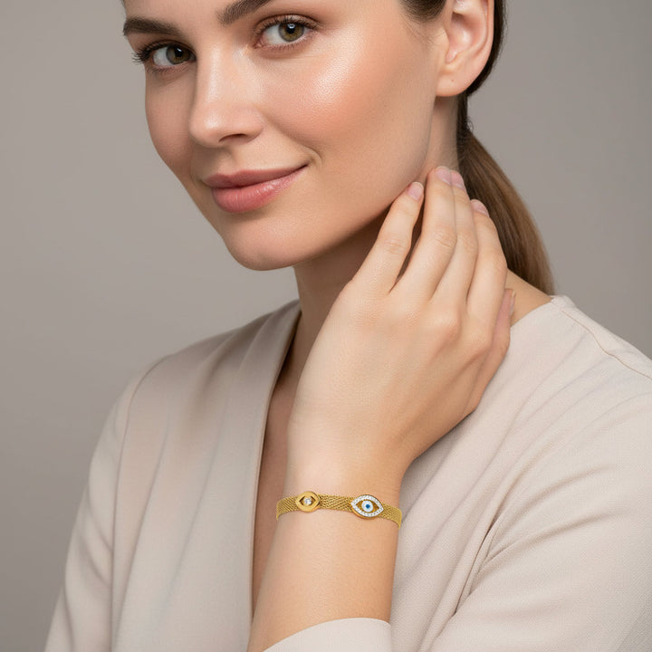 Crafted with an unwavering commitment to exquisite detail, this E.B.belle bracelet is more than just an accessory; it's a tangible symbol of your aspirations for abundance and wealth. The delicate mesh chain, meticulously plated in radiant gold, flows effortlessly around your wrist, catching the light with every movement. At its heart, the striking "Three Eyes" motif, a powerful emblem of foresight and protection, serves as a constant reminder to stay attuned to opportunities and safeguard your blessings. Each element is thoughtfully chosen to resonate with the intention of prosperity, creating a harmonious blend of sophisticated design and potent symbolism. This bracelet is designed to be a constant companion, a subtle yet significant statement of your ambition and your belief in a future filled with richness and fulfillment. Its hypoallergenic and tarnish-free properties ensure enduring beauty and comfort, allowing you to wear your wealth aspirations with confidence and grace, day after day, as it becomes an intrinsic part of your personal narrative of success.
