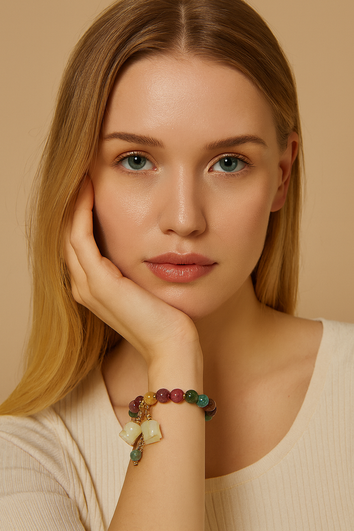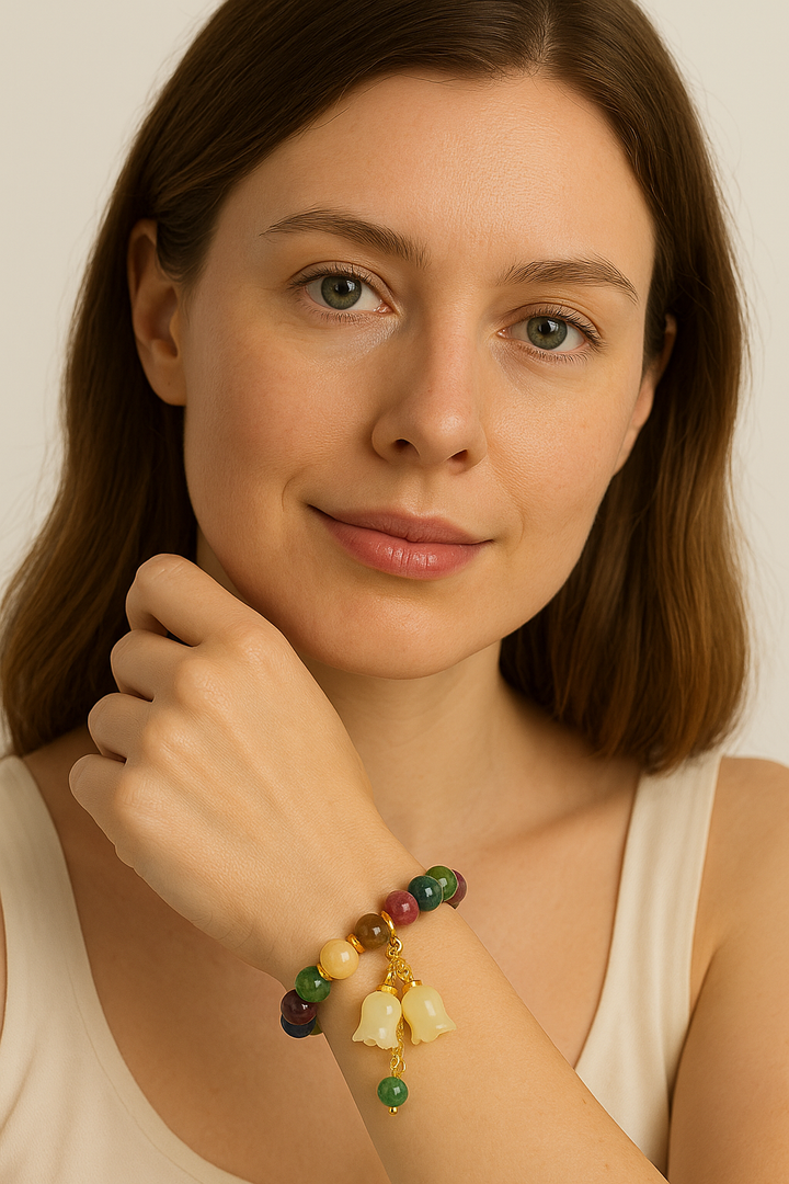 Expertly crafted for versatility and elegance, this adjustable charm bracelet combines vibrant natural stones with a delicate Lily of the Valley flower pendant. Designed for modern women seeking sophistication and symbolic resonance, it transitions seamlessly from daytime chic to evening glamour. The hidden safety clasp and elastic beaded design ensure comfort, while the lotus-inspired motifs evoke purity and renewal. A perfect fusion of fashion symbolism and practical wearability, this piece doubles as both a meaningful talisman and a radiant party accessory.