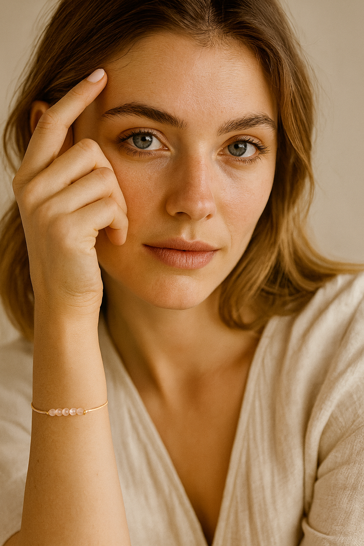 • 4mm Rose Quartz: The quintessential heart healer, known to dissolve emotional wounds and rebuild self-acceptance. Its gentle vibration helps release comparison traps and body insecurities.