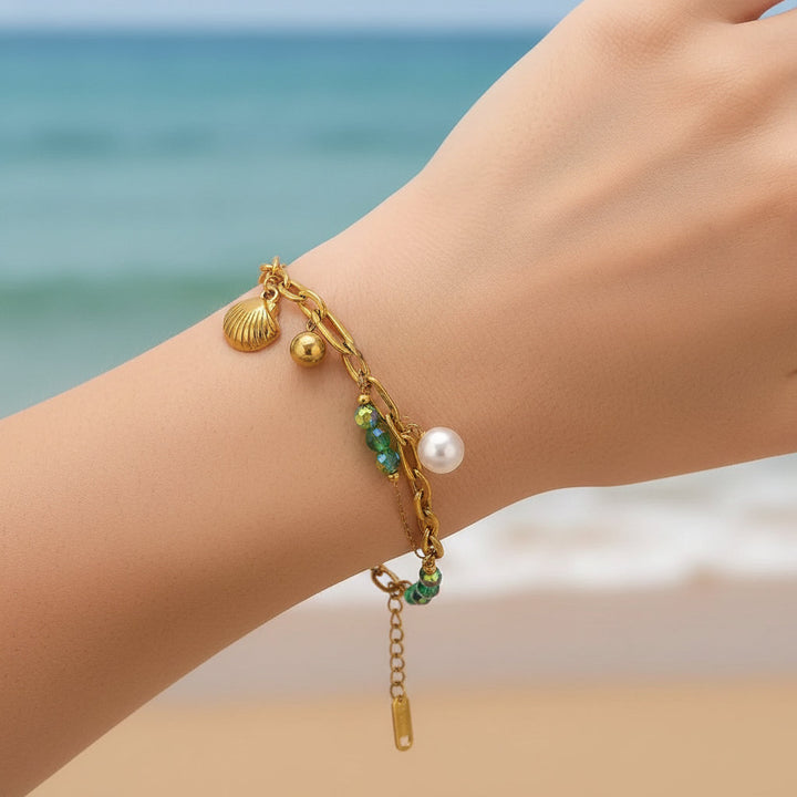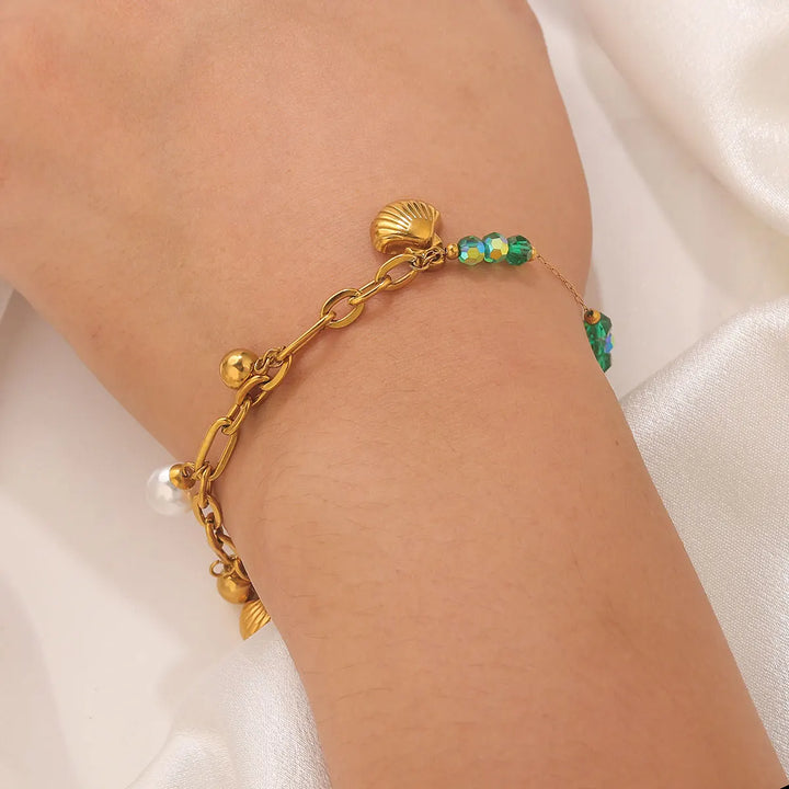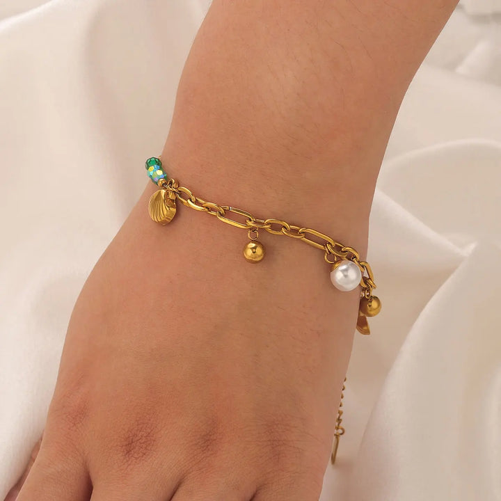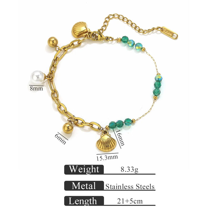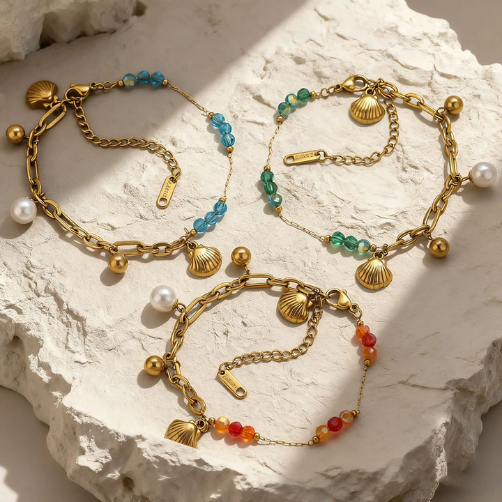 This bracelet is more than just an accessory; it's a wearable embodiment of oceanic tranquility and feminine strength, designed to resonate with the soul and elevate your everyday style. Each element has been thoughtfully chosen to evoke the serene beauty of the sea, from the iridescent glow of the shell pearls to the vibrant allure of the ocean gemstones. The Y2K-inspired design whispers of carefree summer days and a playful spirit, making it the perfect companion for beachside strolls, sun-kissed adventures, or simply adding a touch of playful elegance to your ensemble. Feel the gentle embrace of its feminine healing properties as it harmonizes your inner self, promoting a sense of peace, confidence, and radiant well-being. This piece is crafted to be a constant reminder of your innate grace and the boundless beauty that surrounds you, a treasured talisman for the modern woman seeking connection and enchantment in her adornments. It’s a testament to the enduring allure of the ocean, captured in a piece of jewelry that feels both deeply personal and universally captivating, designed to be cherished and worn with joy, season after season.