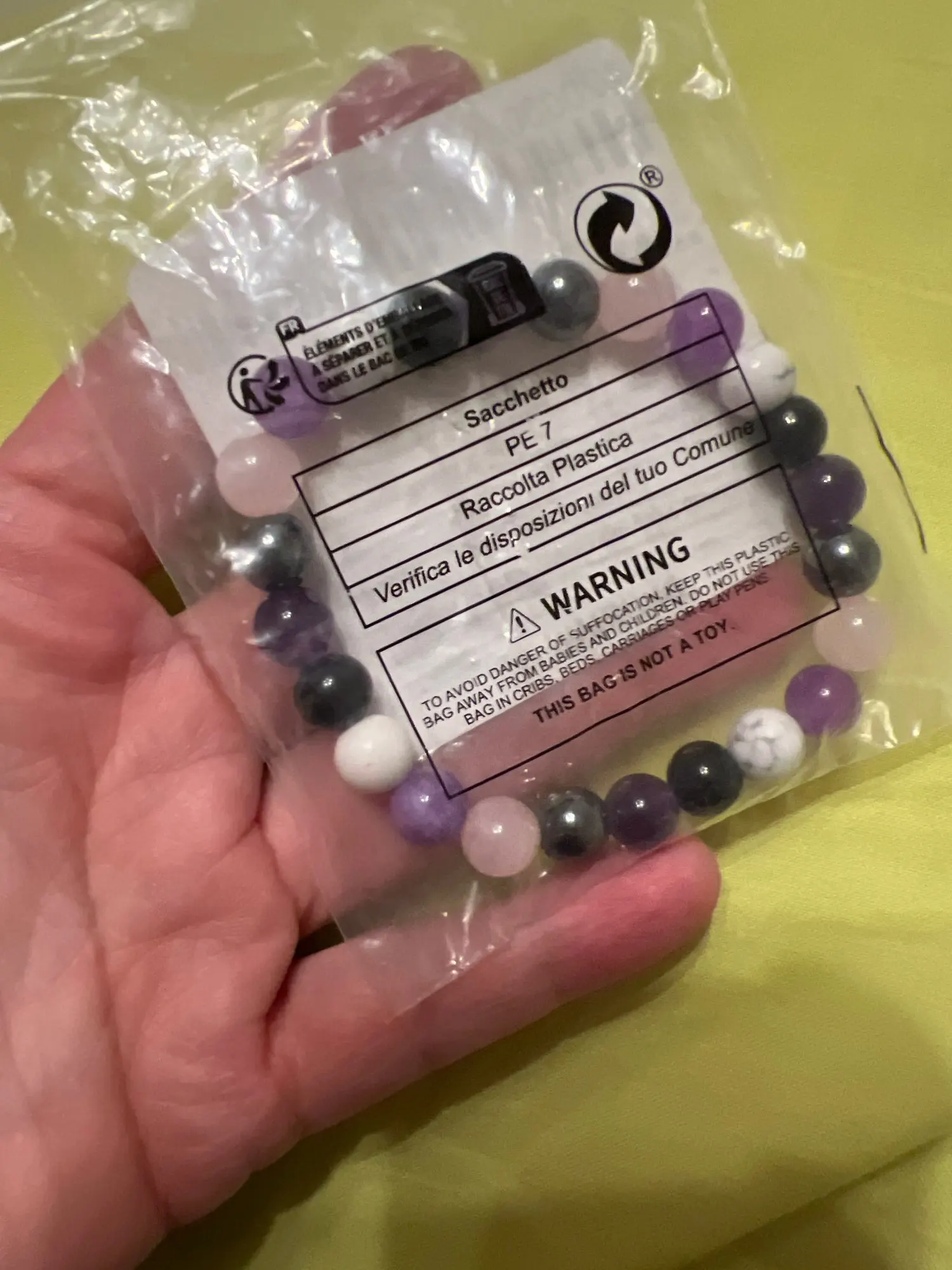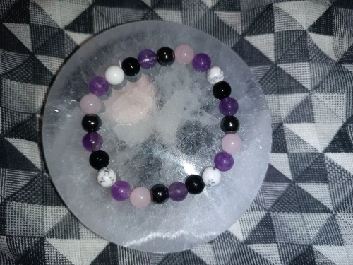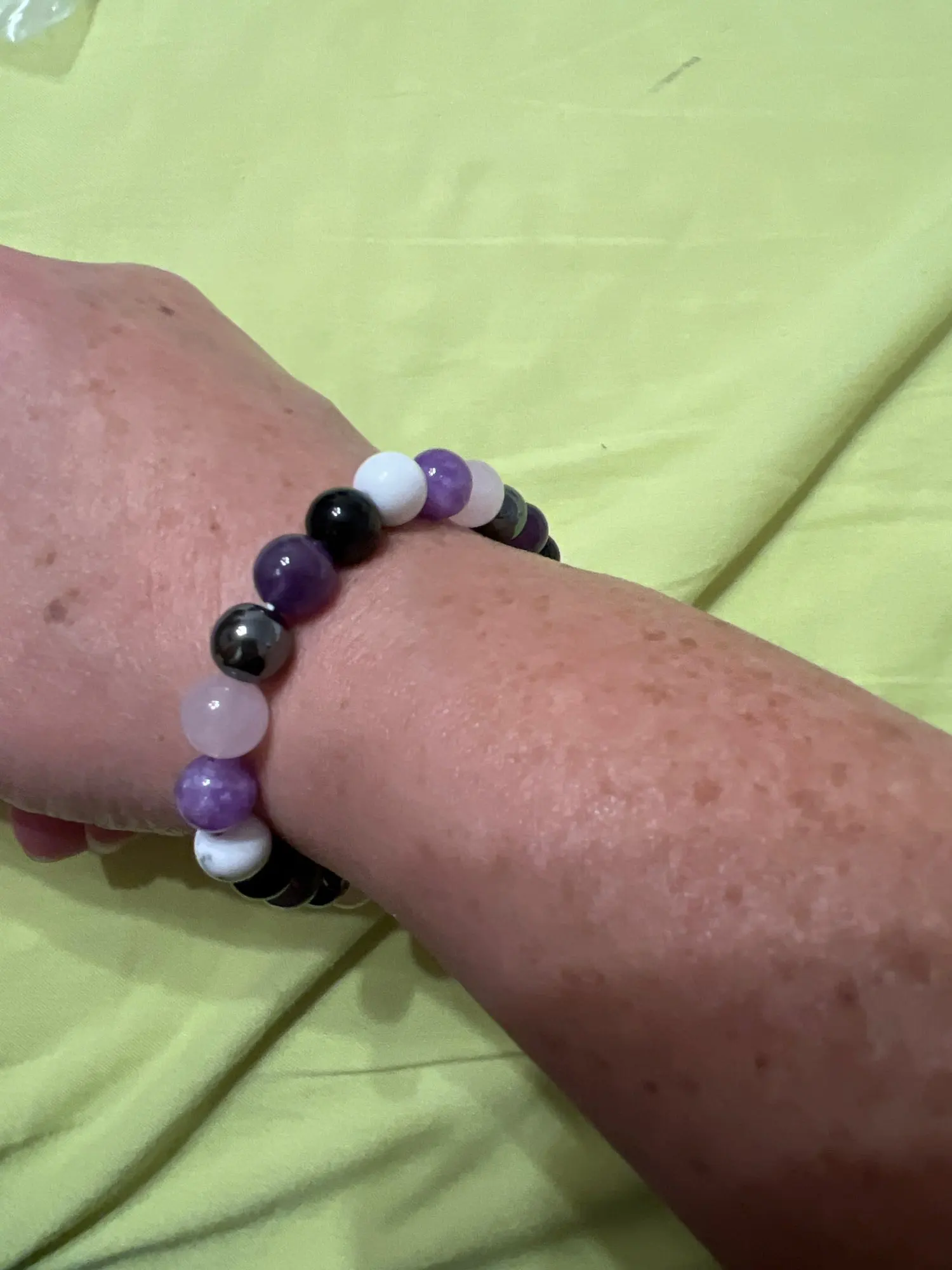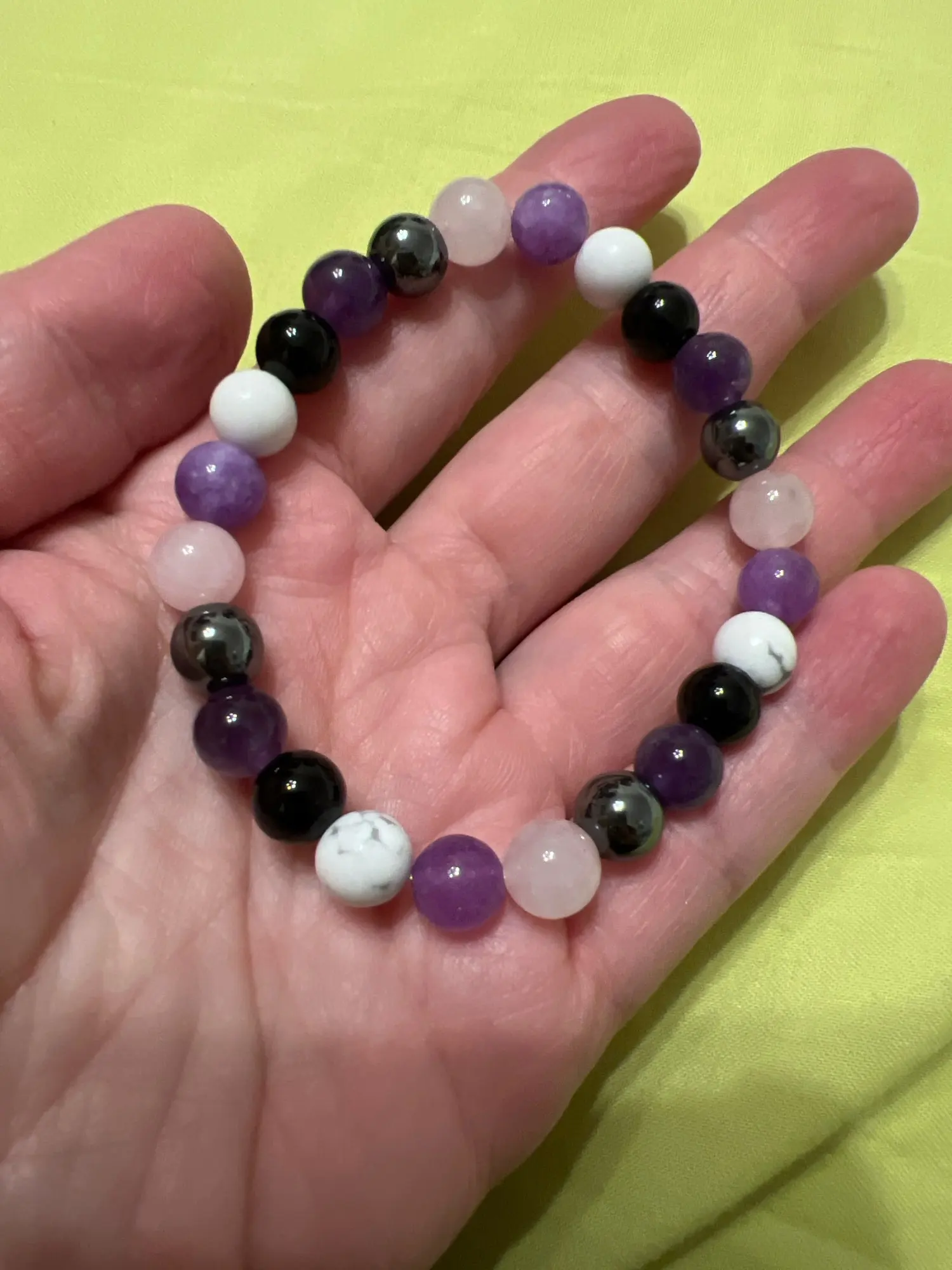 A symphonic fusion of Amethyst, Black Tourmaline, Clear Quartz, Hematite, Lepidolite, Rose Quartz, and White Howlite—engineered to ground your energy, clear mental fog, and gently dissolve anxiety, one bead at a time.