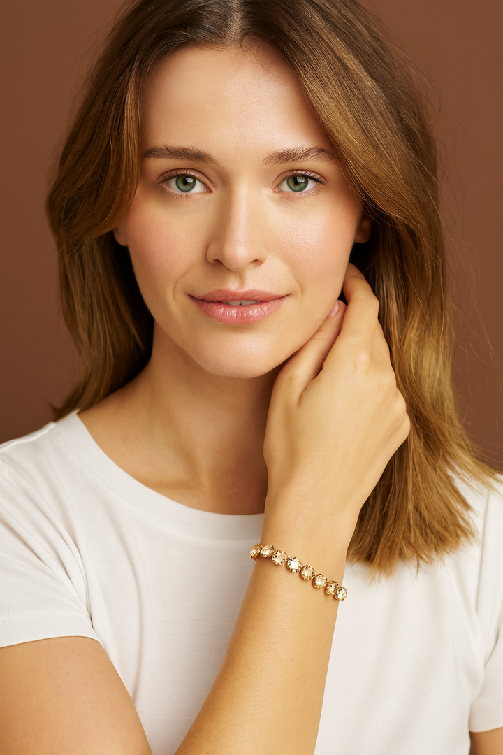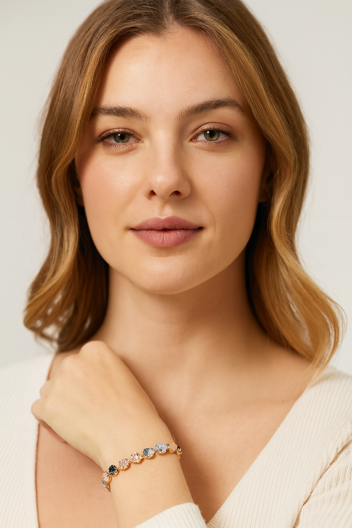 The journey of this bracelet begins with the careful selection of premium materials. High-quality cubic zirconia, renowned for its brilliance and fire, is expertly cut into perfectly round facets to maximize light reflection—creating the mesmerizing rainbow sparkle that gives the piece its name. The chain is crafted from durable copper and luxuriously plated with gold, offering a smooth texture and enduring shine. This thoughtful fusion of materials and artistry ensures that the Rainbow CZ Tennis Bracelet is not only captivating in appearance but also made to last—a timeless treasure that complements every style and occasion.